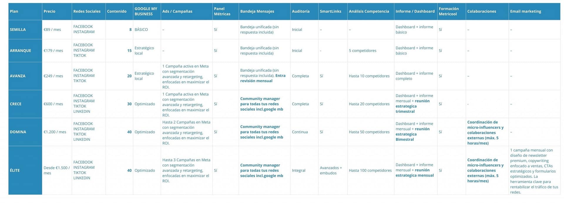 Desde Metricool tendrás todas tus conversaciones en una bandeja unificada, lo que facilita mucho responder. Si prefieres que lo hagamos nosotros, ofrecemos un servicio de gestión completa por 50 € + IVA al mes.